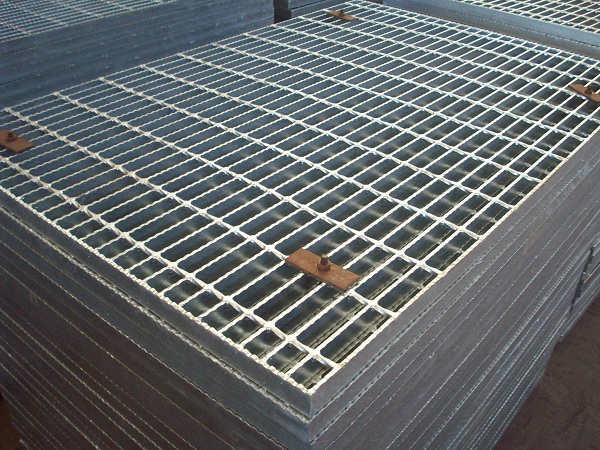 压锁钢格板是先在扁钢上冲孔或槽口,再将横杆横放在均匀排列的扁钢上压入扁钢预制的槽口内,该产品美观,但是强度不高。